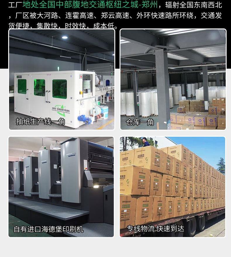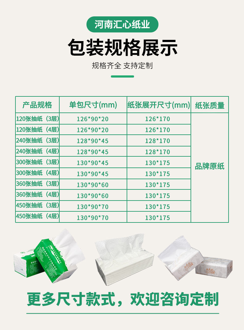 产品尺寸:130*90*52mm 内纸尺寸:130*175mm 净含量:120抽3层(360张) 外箱尺寸:64*50*65cm 主要成分:原生木浆 执行标准:GBT20808 卫生标准:GB15979 卫生许可证:(豫)卫消证字(2024)第0063号 产品等级:合格