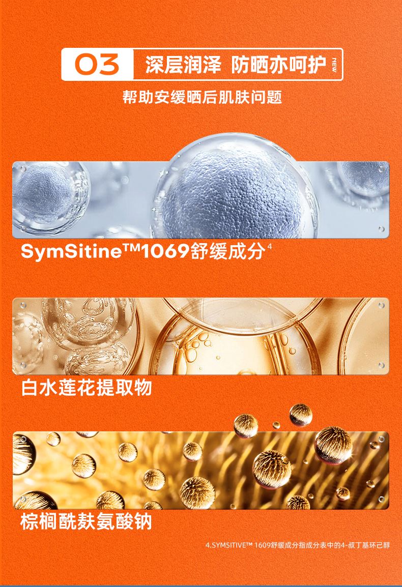 SymSitive™ 1609舒缓因子,有效舒缓晒后灼热肌肤抗氧修护因子-白睡莲花提取物+棕榈酰脯氨酸、修护光损伤,修护晒红、晒伤、晒斑