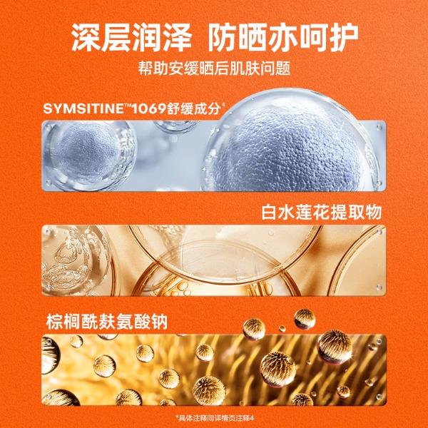 高效补水因子——泛醇+多元醇,瞬时保湿锁水;长效锁水因子——天然甘油,长效水润深润滋养肌肤,去除干纹。8H长效保湿,深润滋养,一瓶=防晒霜+身体乳。