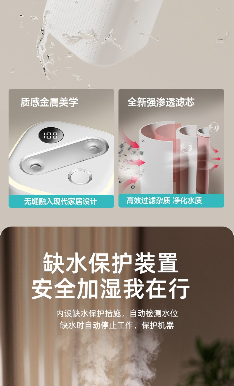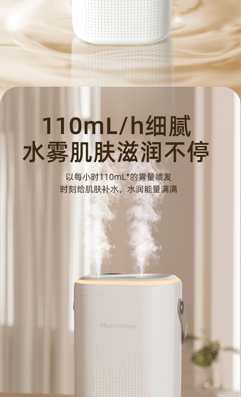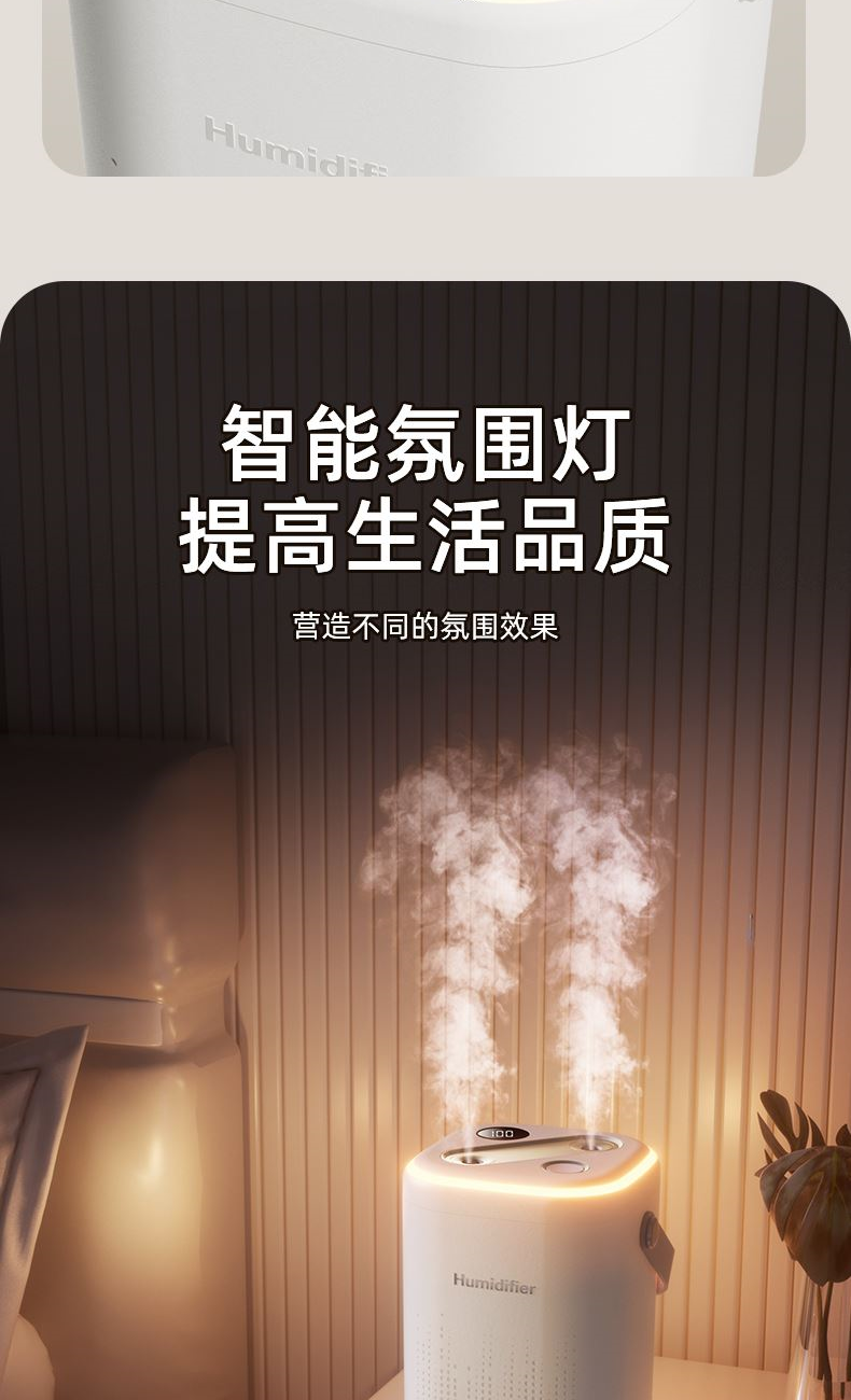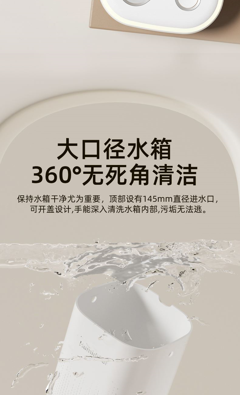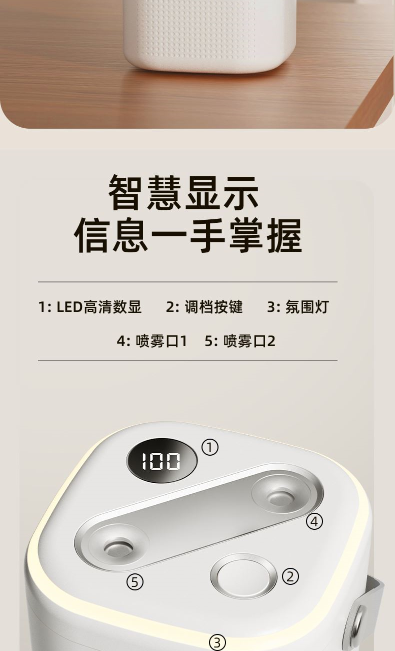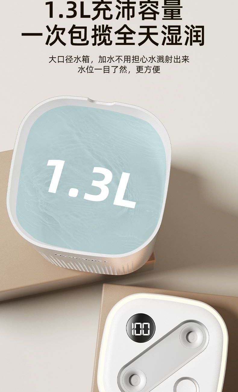 1. 1.3L大容量,持久补水; 2. 微米细雾,清透水润; 3. 智能氛围灯; 4. 1800mAh大容量,7小时长时间续航; 5.大口径水箱360°无死角清洁; 6.8小时智能断电