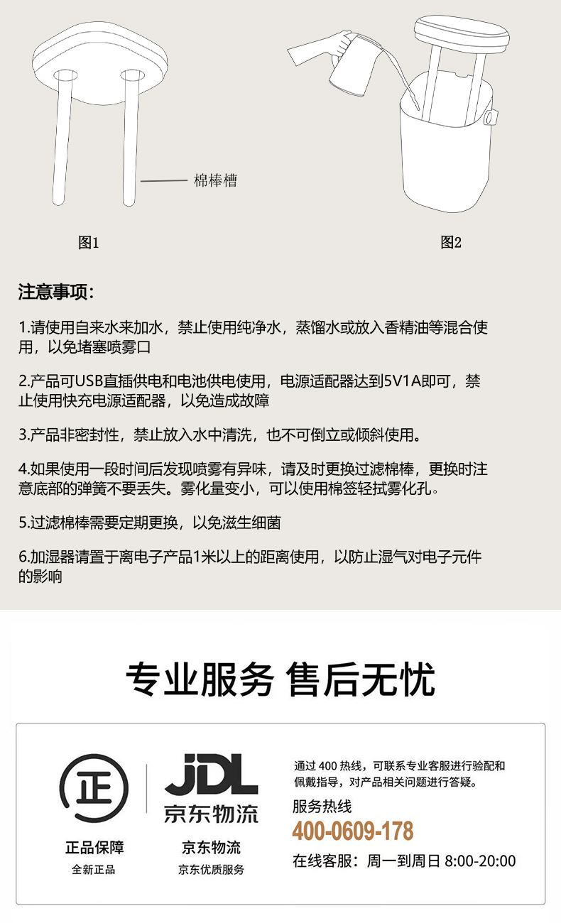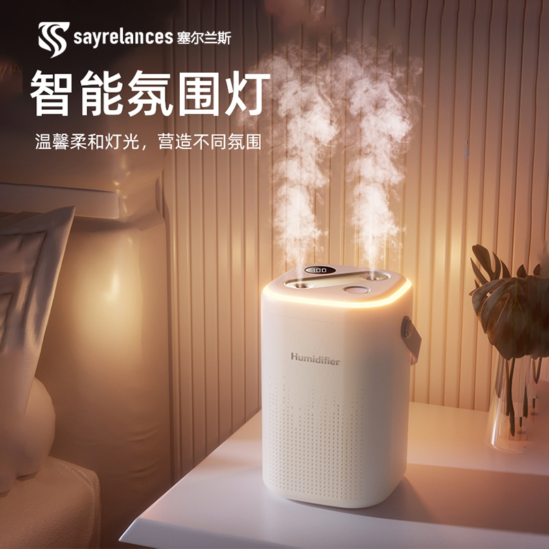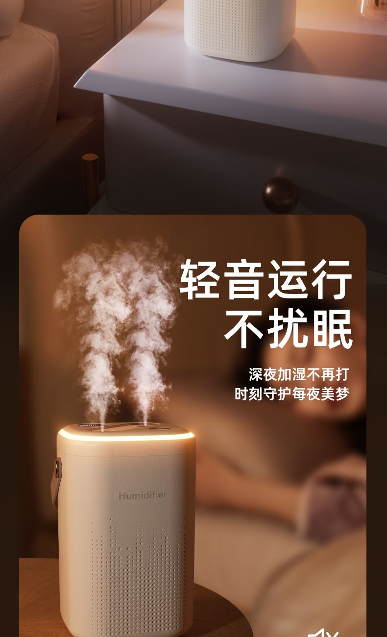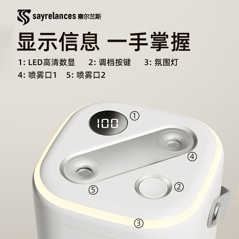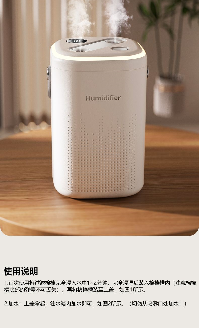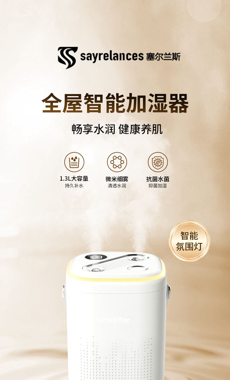 1. 1.3L大容量,持久补水; 2. 微米细雾,清透水润; 3. 智能氛围灯; 4. 1800mAh大容量,7小时长时间续航; 5.大口径水箱360°无死角清洁; 6.8小时智能断电