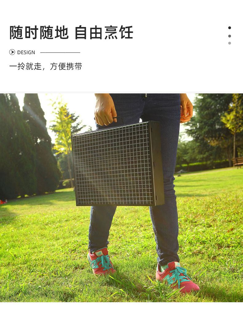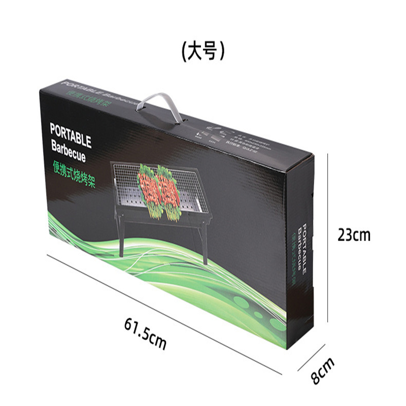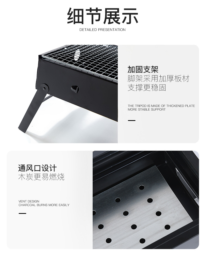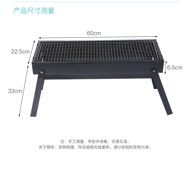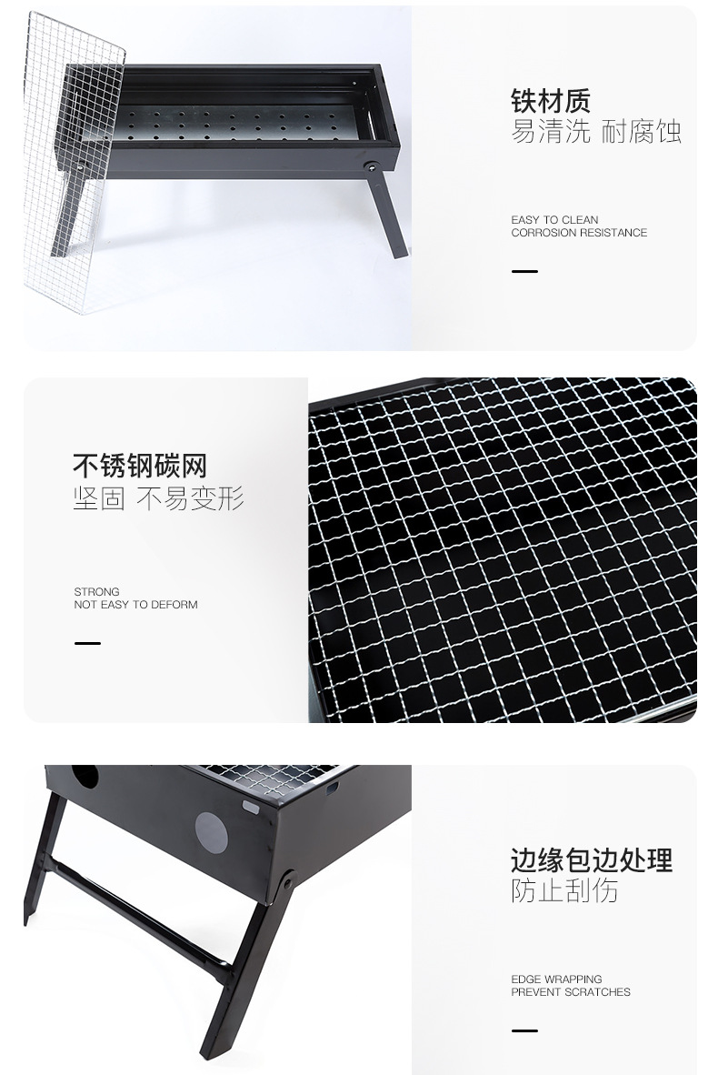 材质:冷扎铁 展开尺寸:63.5*42*48cm 颜色:铁黑 类型:炭烧烤架 净重:2.6kg 包装:PE+彩盒 1、便携折叠设计,不占空间; 2、大尺寸大容量,冷扎铁底座; 3、分布式设计,受热均匀; 4、精美彩盒包装;